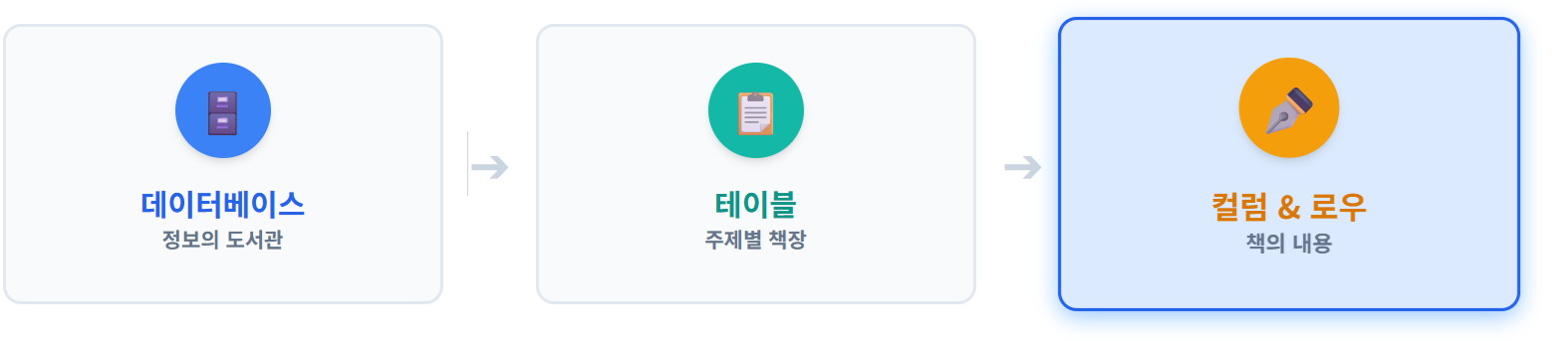 테이블은 데이터베이스 내에서 데이터를 실제로 저장하는 가장 기본적인 구조입니다. 도서관의 특정 주제(예: '역사')를 다루는 '책장'에 비유할 수 있습니다. 테이블은 하나 이상의 '컬럼(열)'과 0개 이상의 '로우(행)'로 구성된 2차원 표 형태를 가집니다.